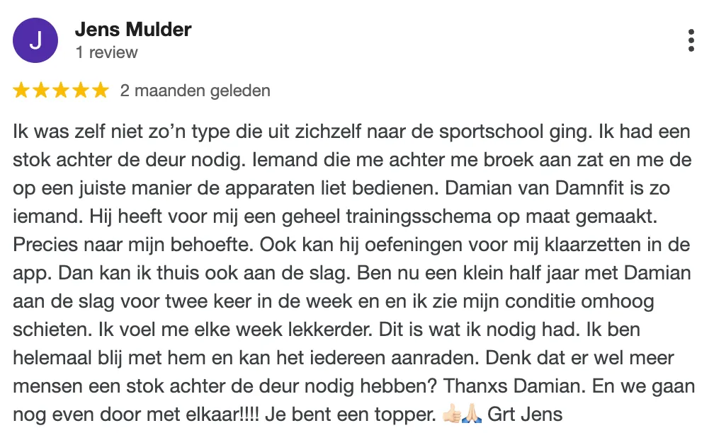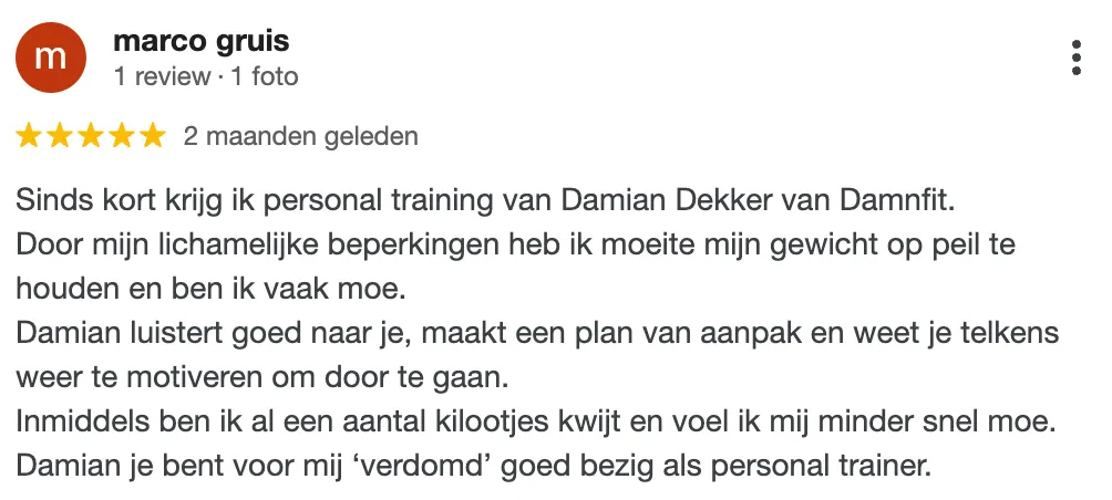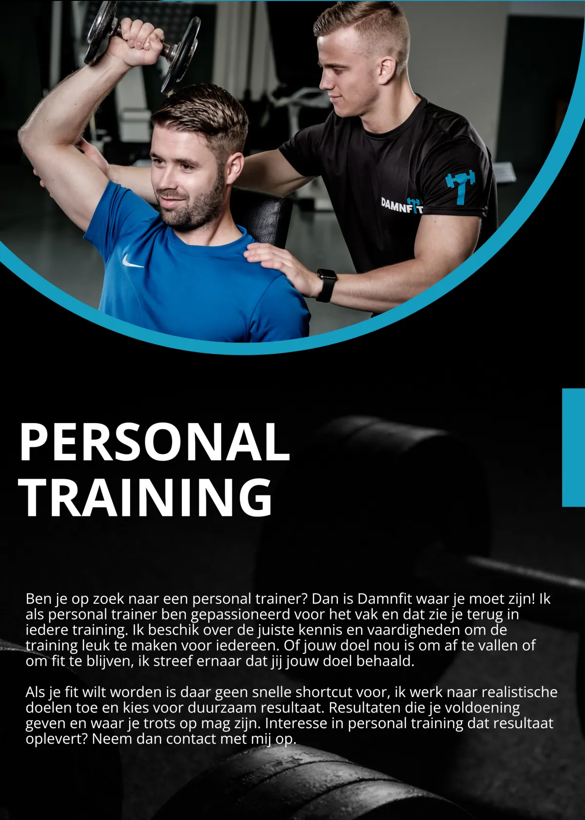 Damnfit Personal Training. Opgericht door Damian Dekker uit een oprechte passie voor fitness en welzijn. Damnfit biedt een oplossing die specifiek op jouw behoeften is afgestemd. Bij Damnfit ben je geen nummer, maar een prioriteit. Door persoonlijke aandacht en op maat gemaakte voedings- en trainingsplannen begeleiden we je op jouw weg naar een gezonder en fitter leven.